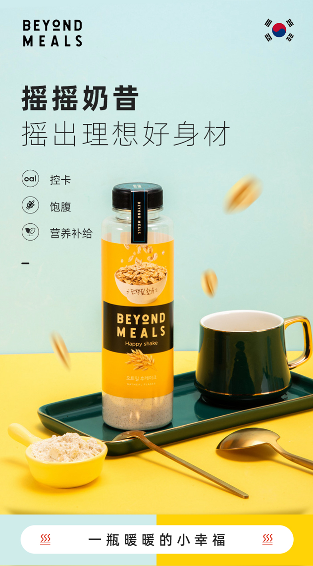 这款Beyond Meals 代餐奶昔/固体饮料,韩国原装进口,甄选优质进口原材料:德国乳清蛋白、新西兰脱脂奶粉、罗马尼亚抗性糊精、德国菊粉制成,富含30多种维生素+矿物质,每瓶不到260大卡,奶茶口味喝不腻,1瓶1餐,可帮你节省1小时运动量。使用方法:可冷水冲泡,直接往瓶中加水至水位线(约200mL),充分摇匀后饮用。