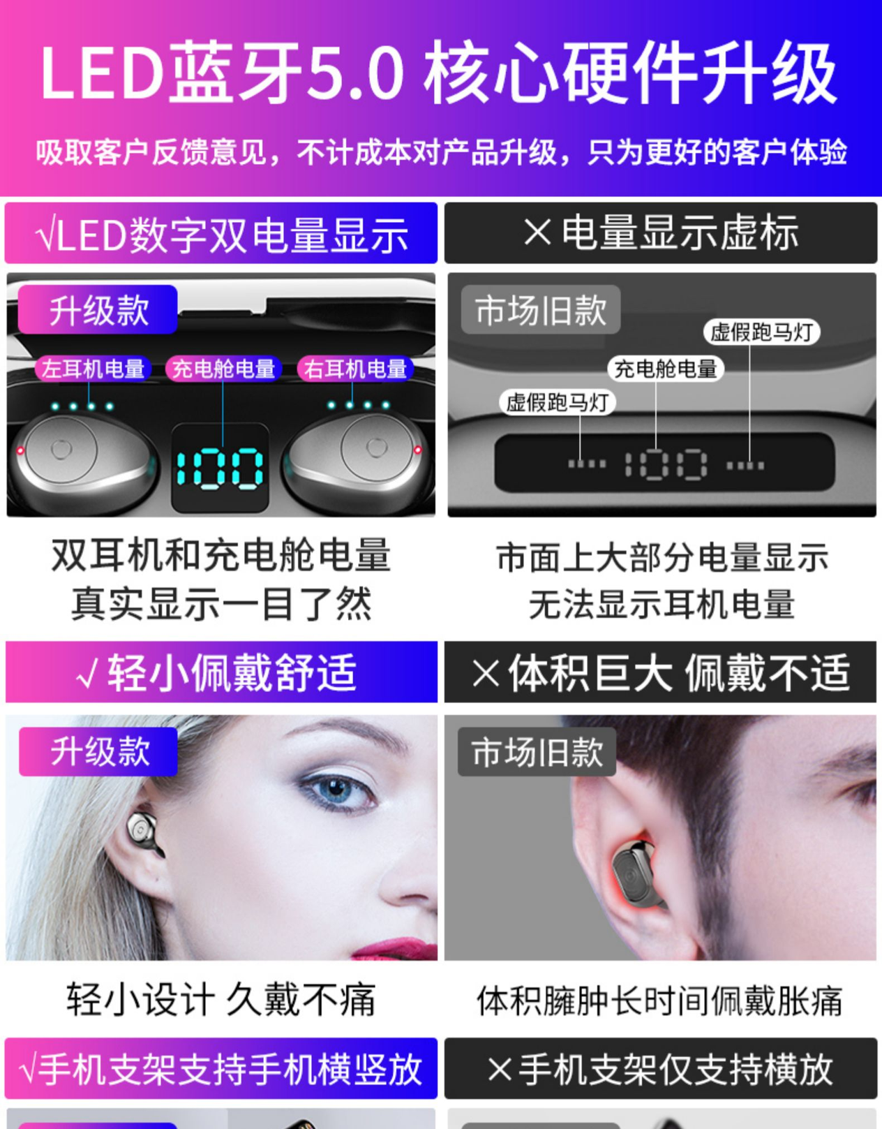 夏新大品牌,F9蓝牙耳机,4色可选,超小迷你,入耳式,可无线蓝牙连接,二次自动闪速配对,5D环绕立体音效,配有充电仓(可给手机充电),持久续航280小时,机身IPX7级防水,运动外出也不怕。