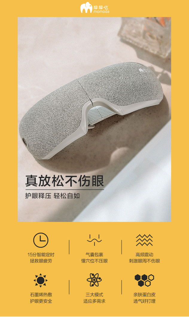 气压仿人手挤压揉捏,震动按摩,配合石墨烯热敷,石墨烯是目前世界上最轻、最薄、硬度最高、韧性最强的新型纳米材料,拥有超强导电、导热性能,能瞬间升温,较传统眼部按摩器增大了60%以上的热敷面积,全面地加速眼部血液循环,更深入放松眼部肌肉,有效舒缓眼睛酸涩肿胀。