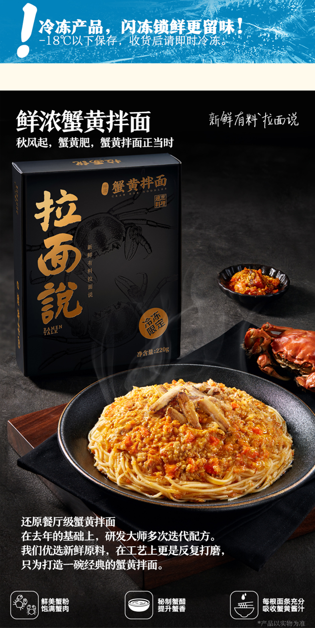 这款拉面说 蟹黄拌面,在去年的基础上,研发大师多次迭代配方,在工艺上更是反复打磨,每包蟹酱,蟹黄含量约等于1只2两母蟹,蟹粉绵密醇香、蟹肉甜嫩酥软。