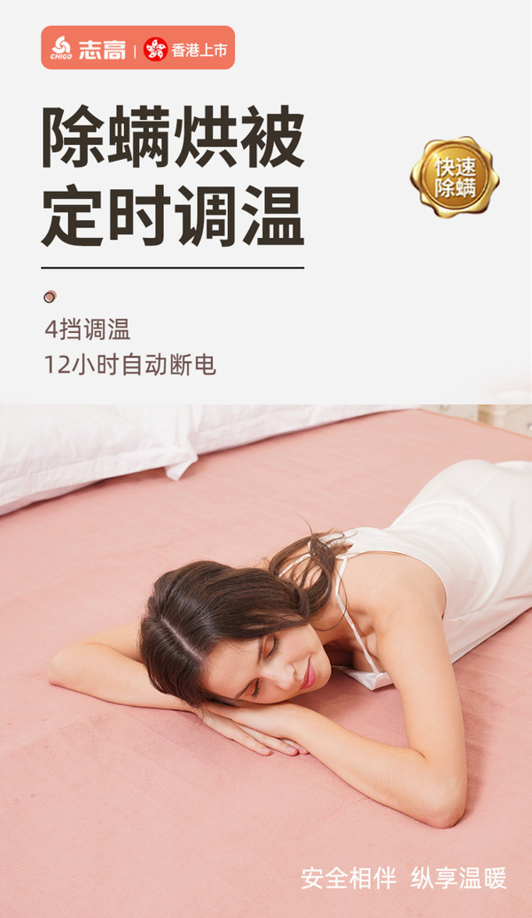 天猫chigo志高鑫溶铭专卖店69元,可领30元优惠券,实付39元到手,第二款单人此价,另有多尺寸可选,单人单控,超柔软亲肤超毛绒面料,保暖加倍,舒适加倍,可12小时定时,自动断电保护,更放心,新增除螨功能,一键除螨亲肤健康~