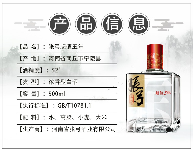 张弓酒,产于河南商丘,以优质高梁为原料,用小麦、大麦混合制曲,淀粉含量高,易于酿酒发酵,通过固体发酵,酒体澄清透明,窖香浓郁,诸味协调,绵软适口,尾净味长。规格:500ml*4瓶