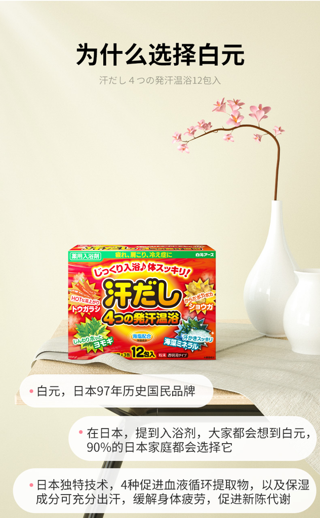 这款白元 爆汗汤生姜艾草泡脚粉 25g*12包,日本独特技术,含有生姜、辣椒、艾草、海藻4种促进血液循环提取物,以及保湿成分可充分出汗,缓解身体疲劳,促进新陈代谢。生姜性温,其特有的“姜辣素”能够使血管扩张、血液循环加快,促使身体毛孔张开,同时还能将体内的病菌、寒气一同带出;辣椒可以很好的将身体中的寒气逼出体外,促进脚底的神经循环,预防脚气的发生;艾草温经散寒,活血止痛、可调理气血,消除疲劳,缓解肩痛,增强免疫力。海藻不仅能使肌肤吸收丰富养分和水分,还有消肿、舒缓肌肉紧张的作用。不仅添加了源自日本天然火山温泉的矿物质成分,并添加了草本和保湿成分,具有保湿效果,可以在身体表面形成保温膜,沐浴或者沐足后也会持续温暖感觉。