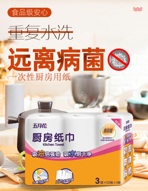 天猫五月花官方旗舰店14.99元,下单立减3元,可领2元优惠券,实付9.99元到手,食品级一次性厨房用纸,3层加厚,强效吸油吸水,不添加漂白剂,安全无毒,干湿两用,去污效果加倍,与传统抹布相比,省时方便又卫生!领券链接点此