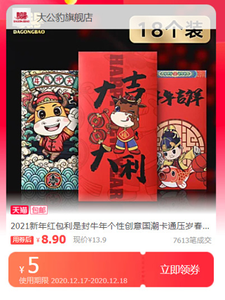 大公豹 2021新年红包 大号 18个装 多款可选,加厚卡纸,大容量空间,创意牛年红包,牛年牛气冲天~