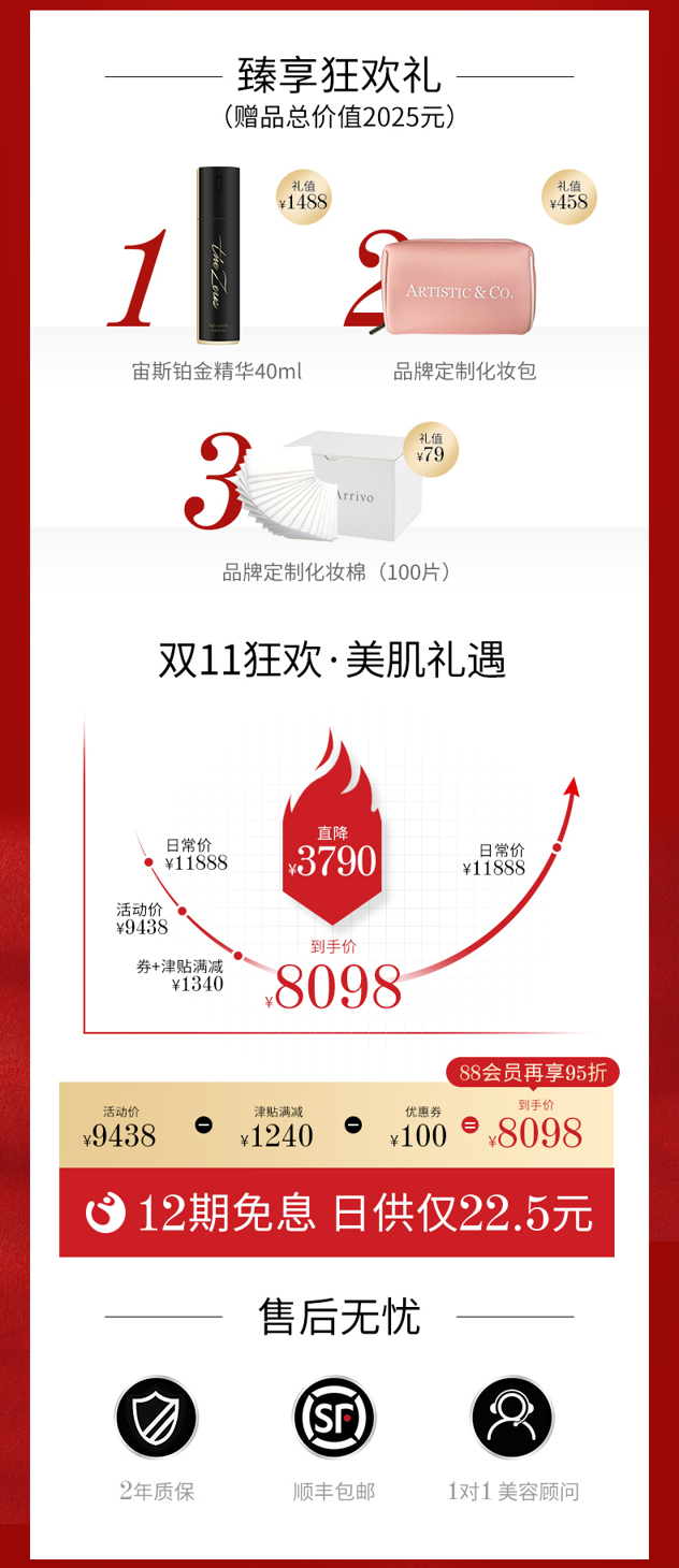 =7828元 到手价(定金100+尾款7728)。MISS.Arrivo全新幻影24K金美容仪,不仅拥有+MFIP(中周波频率断续电刺激)功能,还拥有比旧款高达1.2倍的输出功率,让提拉效果更佳明显,另外高功率输出同时也让EMS的刺激频率达到了每秒钟9万次,促进肌肤下的毛细血管血流量,来让美容液吸收的充分。