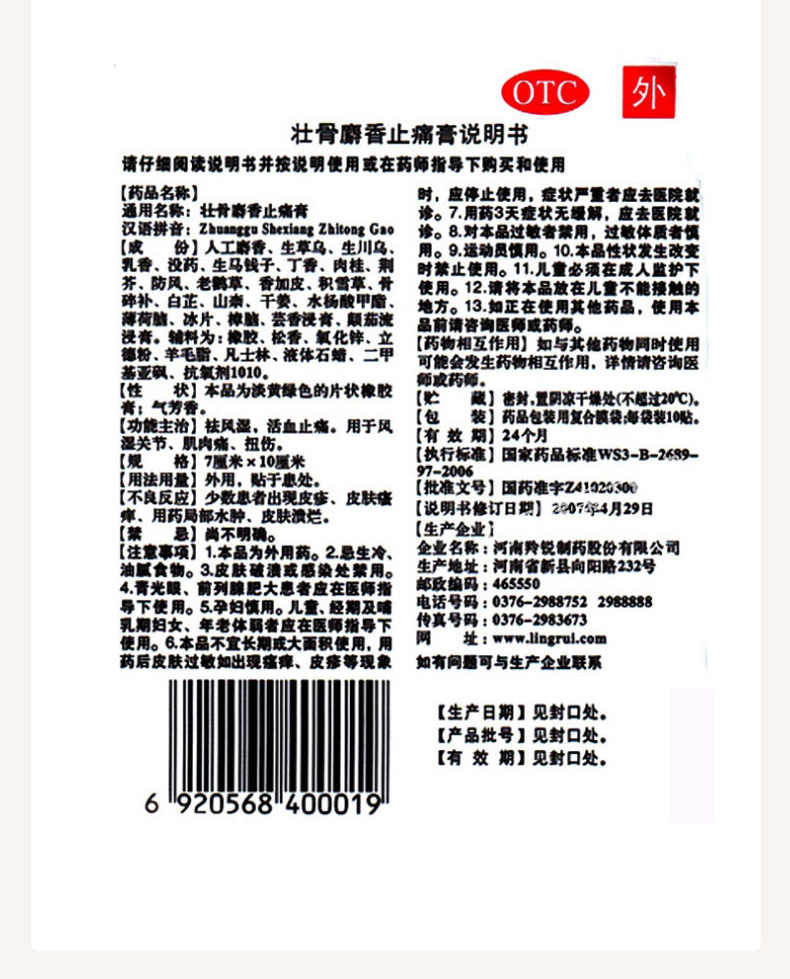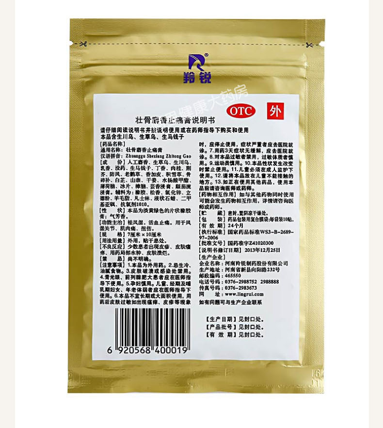 这款羚锐壮骨麝香止痛膏主要成分豹骨、麝香、生草乌、生川乌、乳香、没药、冰片、樟脑、薄荷脑、芸香、颠茄流浸膏、水杨酸甲酯等24味中药材,能祛风湿,活血止痛。用于风湿关节、肌肉痛、跌打扭伤。