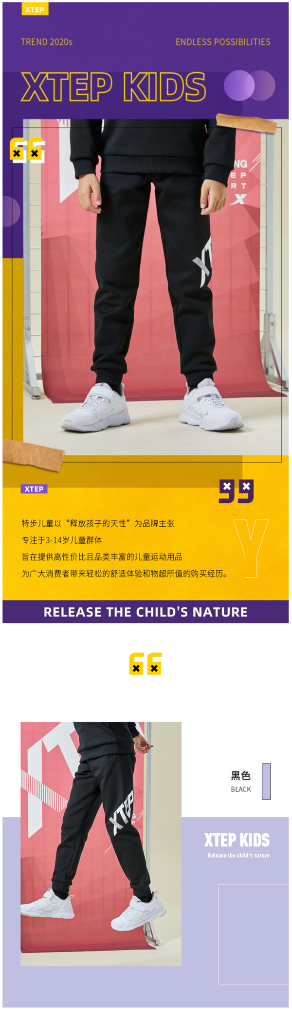 这款特步儿童加绒运动裤,是2020年秋冬新款,采用65%聚酯纤维+35%棉混纺而成,厚度中等,内里拥有接近纯棉的轻柔手感和舒适度,面料质地轻盈,透气舒适。弹力裤腰、罗纹裤脚,裤面上还有XTEP的印花。