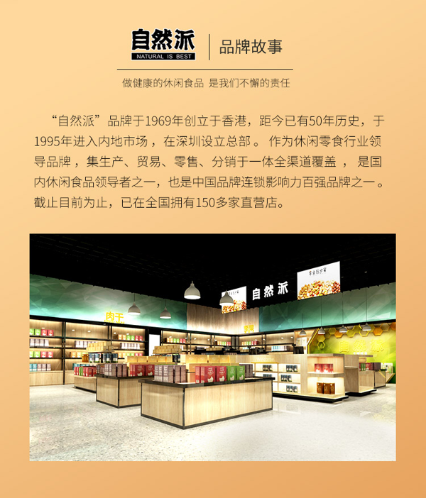 “自然派”品牌于1969年创立于香港,距今已有50年历史,于1995年进入内地市场,在深圳设立总部。作为休闲零食行业领导品牌,集生产、贸易、零售、分销于一体全渠道覆盖,是国内休闲食品领导者之一,也是中国品牌连锁影响力百强品牌之一。截止目前为止,已在全国拥有150多家直营店。