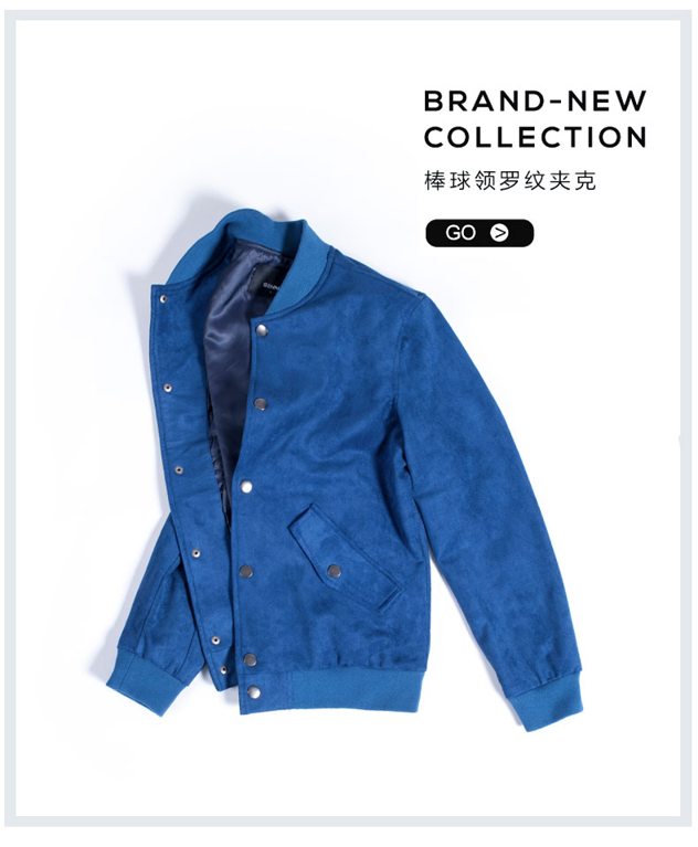 本米棒球夹克,款式上综合了校服夹克、牛仔夹克等几种类型夹克,适合30-40岁有一定社会阅历人群穿着。门襟按扣设计,比常见的拉链款多了休闲感,主色采用与牛仔夹克相似的宝蓝色,显得人年轻,却并不像牛仔夹克一样过分浮夸。短款设计,适中版型,干净利落好搭配。