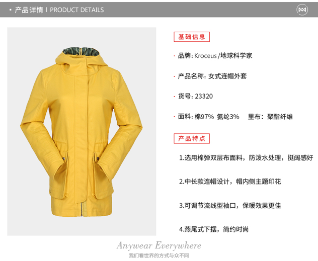 这款地球科学家女秋冬中长款连帽风衣,使用97%棉+3%氨纶弹性的棉弹双层布面料,厚度中等,适合春秋季节穿,表面还进行了防泼水处理,防护效果更好。