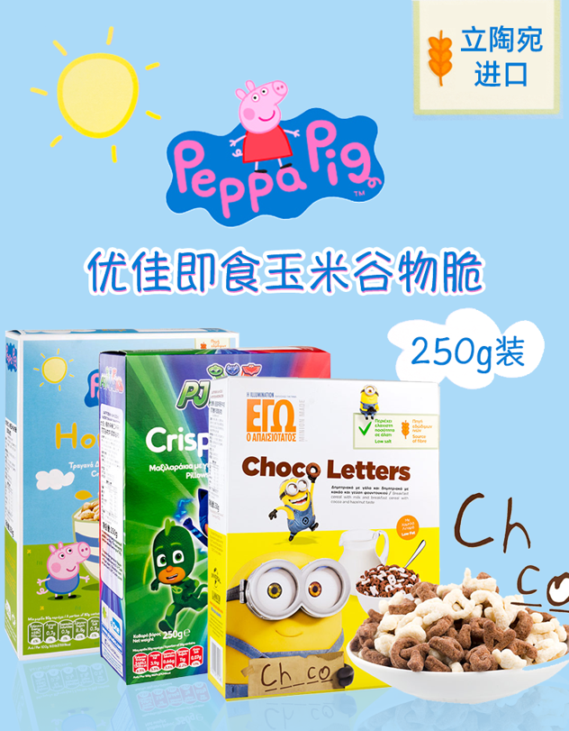 味道上有粉红小猪玉米谷物圈 250g、黄人宝宝字母形牛奶可可麦饼 250g、小睡衣侠榛仁味夹心可可谷物饼250g。