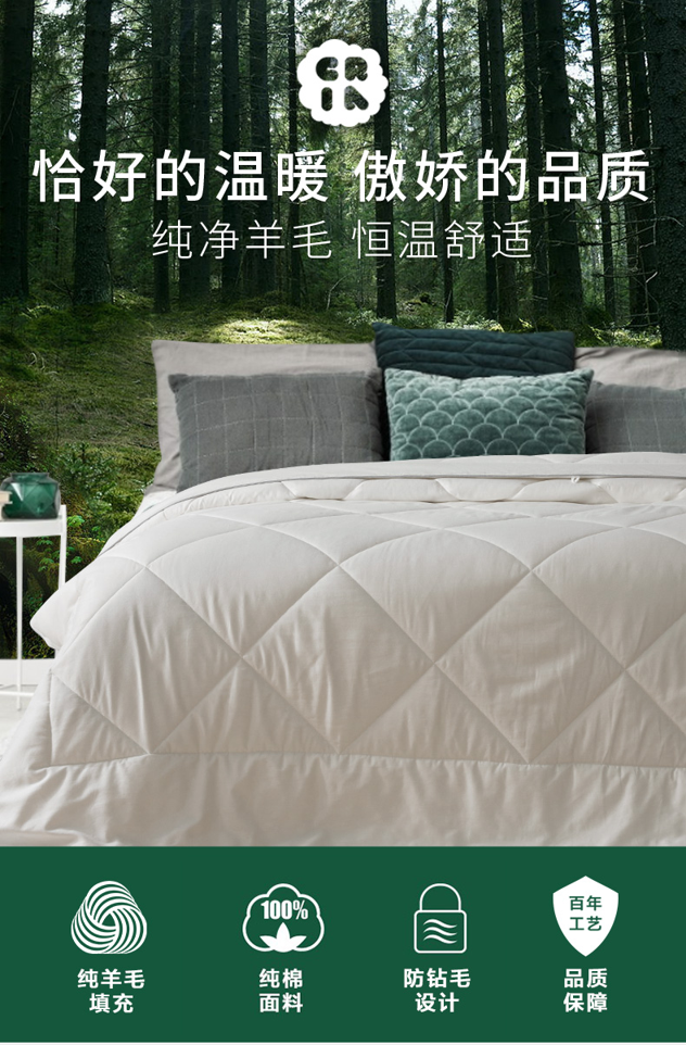 羊毛作为天然填充物可以调节热量和湿度,恒温点37.2度,是人熟睡时的体表温度,助眠更深眠;羊毛拥有至少40%的天然弹性,羊毛被受压后可以恢复原厚度的90%以上,从而保持蓬松、柔软、不板结;