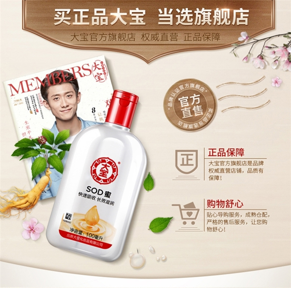 SOD(超氧化物歧化酶)是一种源于生命体的活性物质,能消除生物体在新陈代谢过程中产生的有害物质。对人体不断地补充 SOD具有抗衰老的特殊效果。经常使用大宝SOD蜜,能延缓皮肤衰老,快速渗透,深入滋润,全家适用,四季皆宜。令您皮肤白皙,容颜娇美,青春永驻。