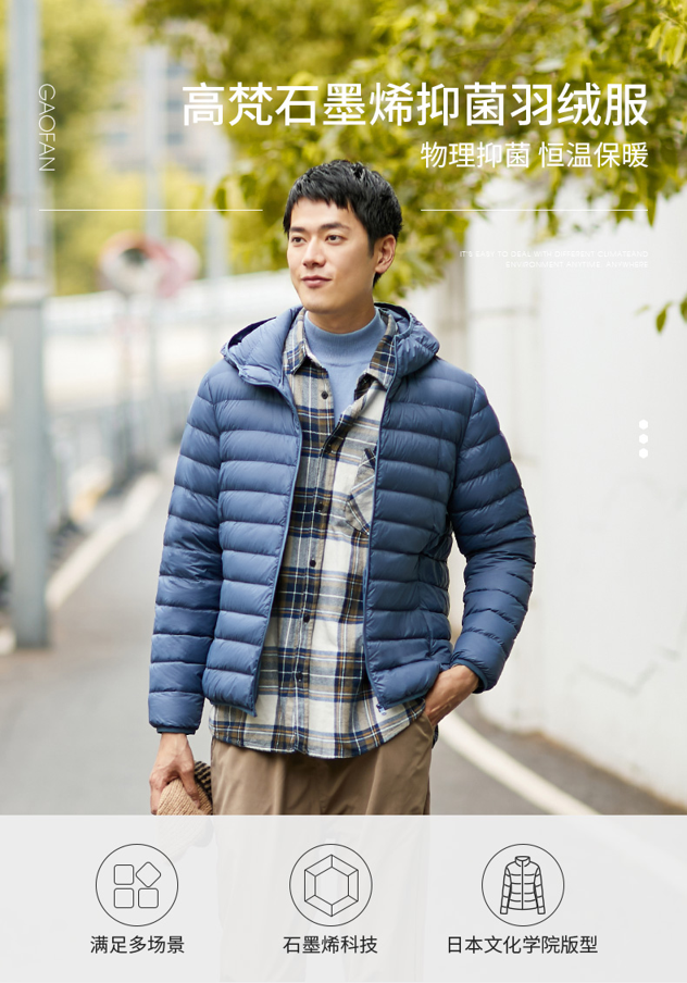 这款高梵羽绒服内里填充90%白鸭绒,蓬松保暖姓高。面料采用石墨烯黑科技设计,达到屋里抗菌效果,安全健康,且防风防小雨,进一步提升保暖效果。拥有成熟防钻绒技术,不易钻绒;修身版型,上身不臃肿。经典连帽纯色款式,休闲百搭。