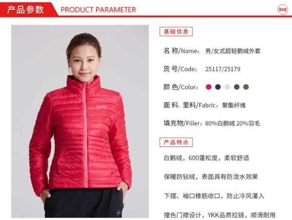 这款地球科学家羽绒服属于轻薄款羽绒服,外层是采用聚酯面料,防风防泼水;内里填充的是600蓬80%白鹅绒,充绒量在70~100g之间,适合秋季、初冬、初春穿。
