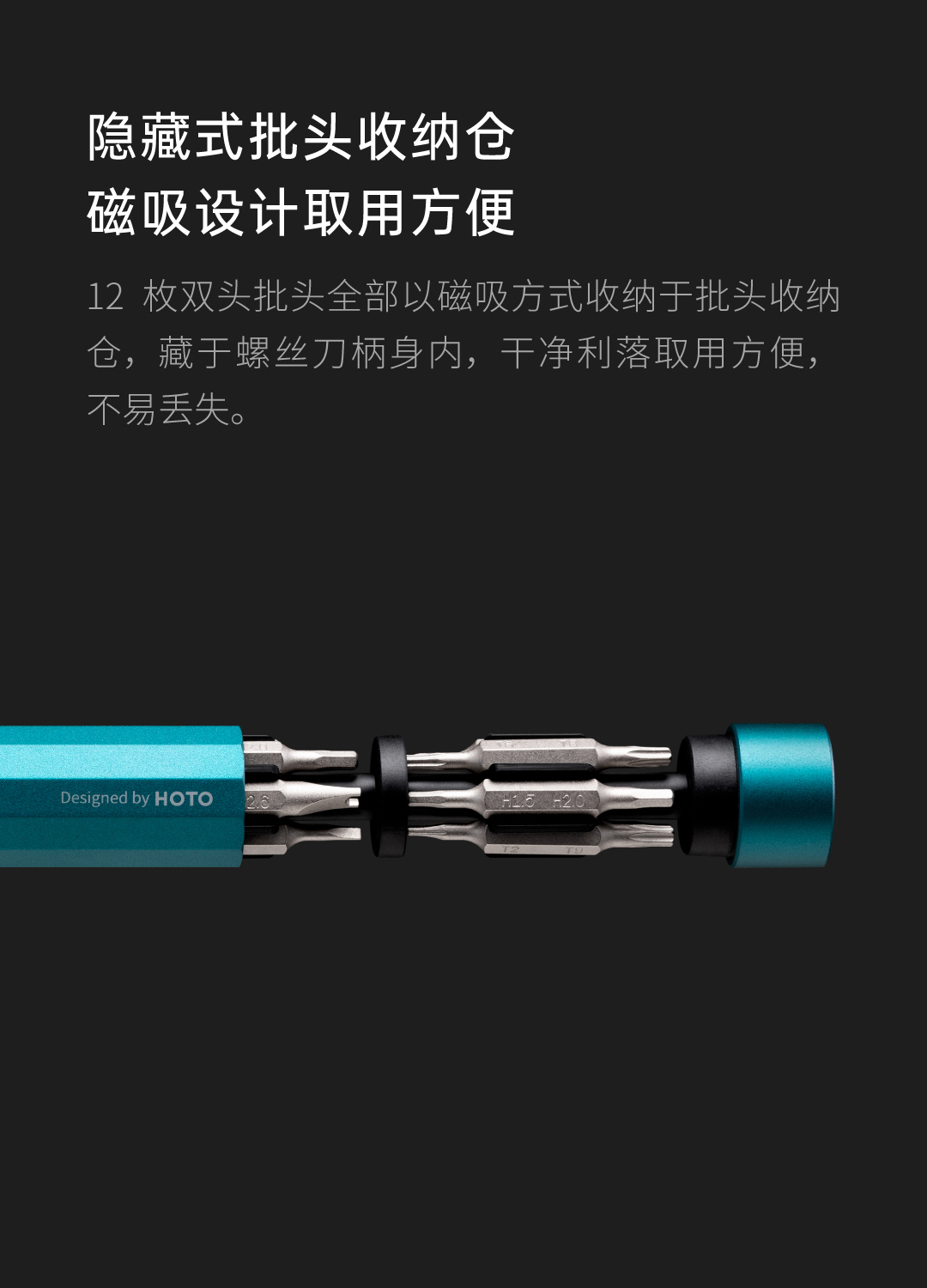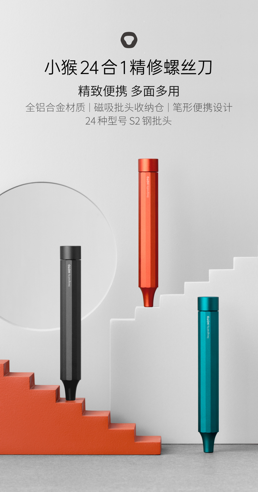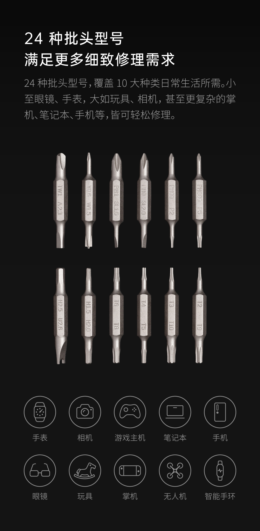 24种批头型号,覆盖10大种类日常生活所需。小至眼镜、手表,大如玩具、相机,甚至更复杂的掌机、笔记本、手机等,皆可轻松修理。磁吸批头安装方式,放入批头后听到“啪嗒”声即 为安装完毕,直接拔出批头即可快速拆下。