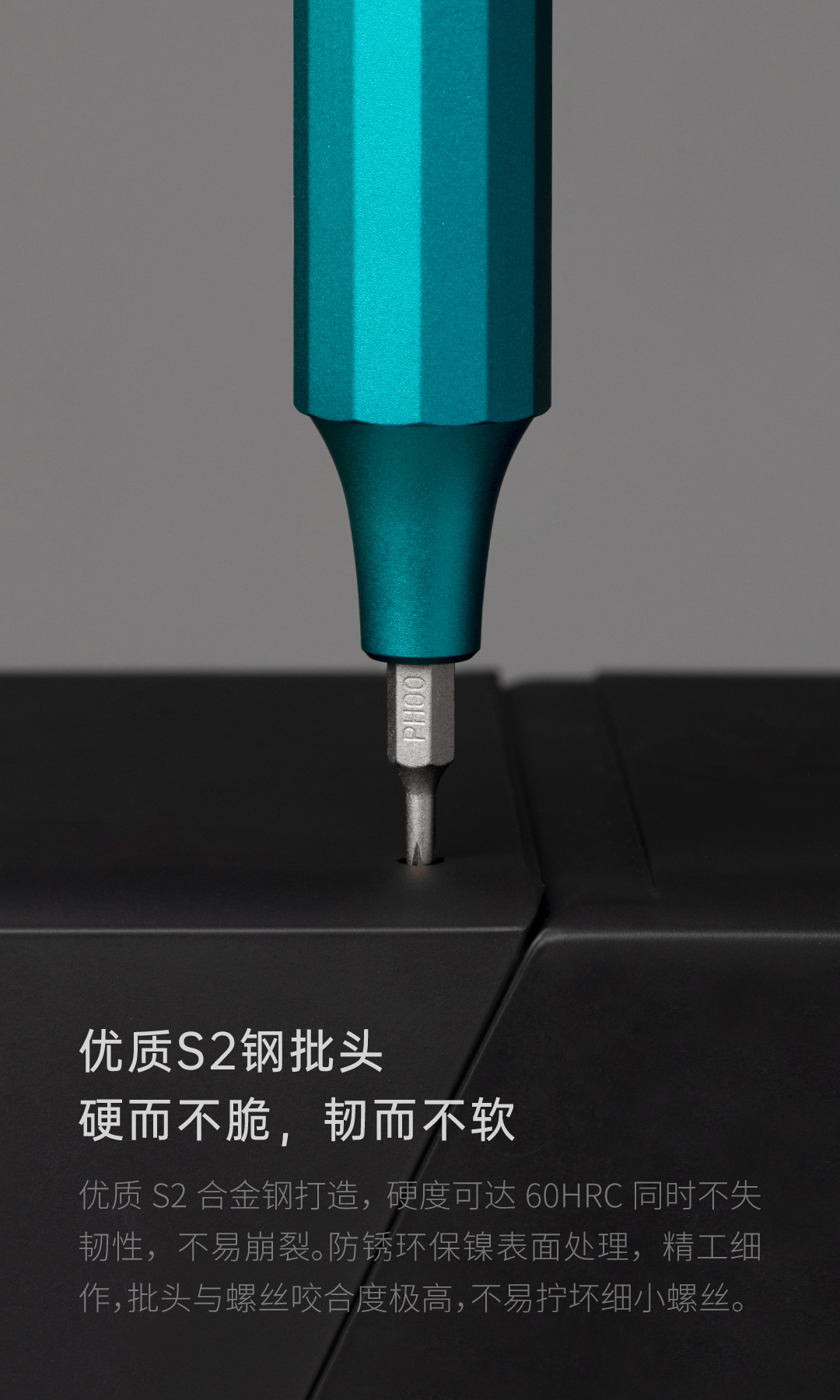 螺丝刀整体皆为铝合金,轻巧高强度。笔身采用铝挤工艺一体成型,无侧面接缝,不易残留脏污。阳极氧化喷砂表面处理,深松绿、辰砂红、板岩黑,三色哑光金属质感随心可选。