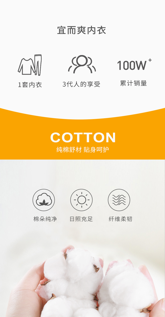 男女多款可选。这款宜而爽保暖内衣采用100%新疆长绒棉面料,要比普通棉纤维更长更细,因此上身更加柔软细腻,吸湿透气性好,亲肤舒适。