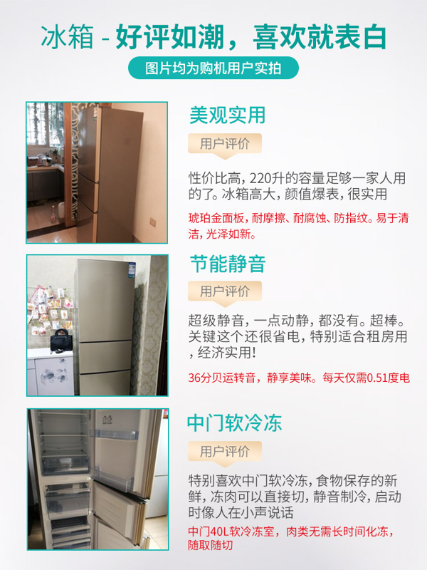 =999元 到手价,88会员可用开会员时赠送的1000-100元购物券,券后实付899元,直降50元,基于价格推荐。220L的容量,适合中小户型,中门还有软冷冻功能,保鲜能力强,冻肉好切。