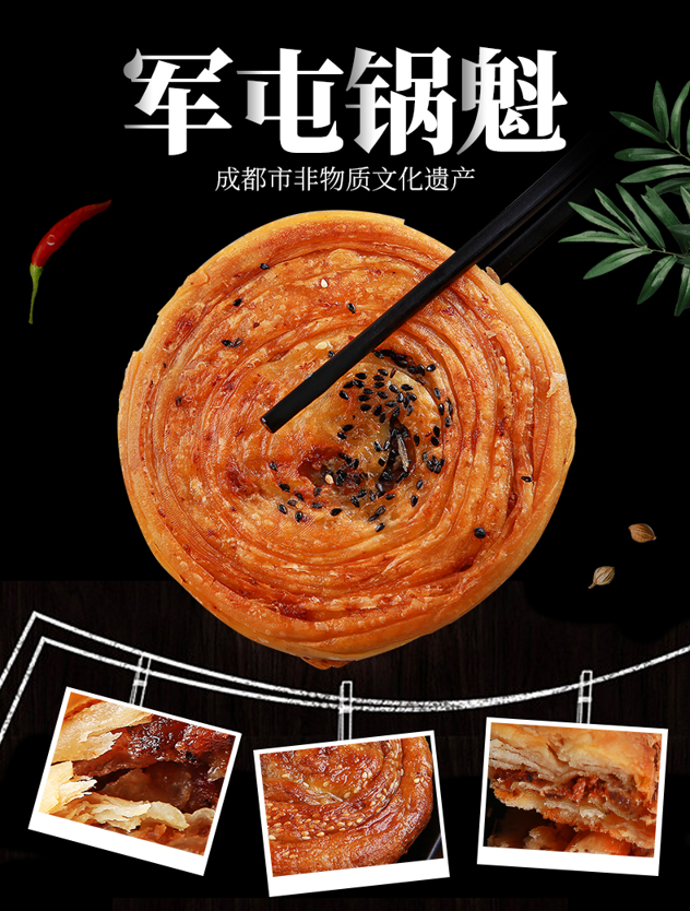 有五香、麻辣两种口味可选。军屯锅盔是成都市非物质文化遗产,源自三国时期,精选面粉、猪肉、菜籽油,秉承古法工艺“一打二抹三翻六转”匠心制作,表皮酥脆,层次分明,内馅肉质饱满,好吃不腻,还原经典四川味道。