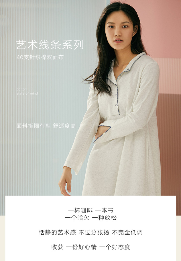 这款睡裙采用40支针织棉双面布面料,要比一般的棉质面料更为挺括有型,手感细腻软糯,上身有温热感,且不易起球起静电,穿着亲肤舒适。款式简洁大方,既适合当做居家服穿,也可当睡裙睡衣或搭配外套,百搭穿着。