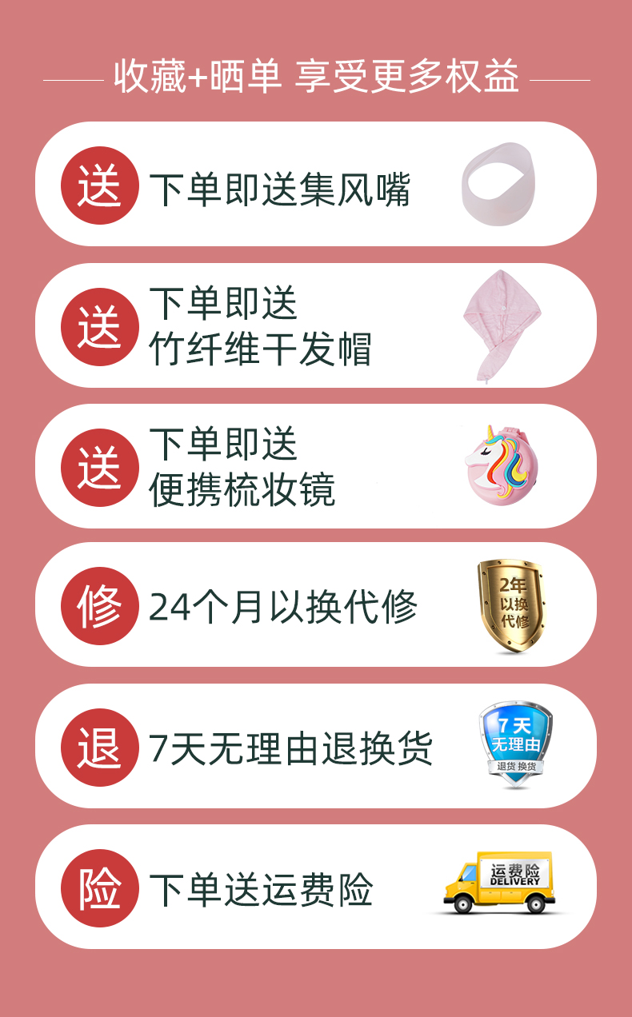 2000转速马达配合风机前置技术,使风力双倍输出;前置风机与疏风窗筑成立体风场,千万级负离子全方位沁入发丝,养发护发。