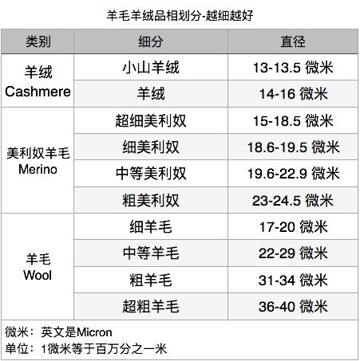 和羊毛一样,羊绒也是以粗细划分等级。在每年春天,牧民在每只成年山羊上,能梳理出100克可用羊绒,纤维直径在14-16微米之间,平均直径在14.5微米,以14微米最为珍贵,是高档羊绒。比山羊绒更为珍贵的,是小山羊绒,每只三个月大的小山羊,可梳理出30-40克更柔的小山羊绒,纤维直径仅为13-13.5微米,被奢侈品垄断。