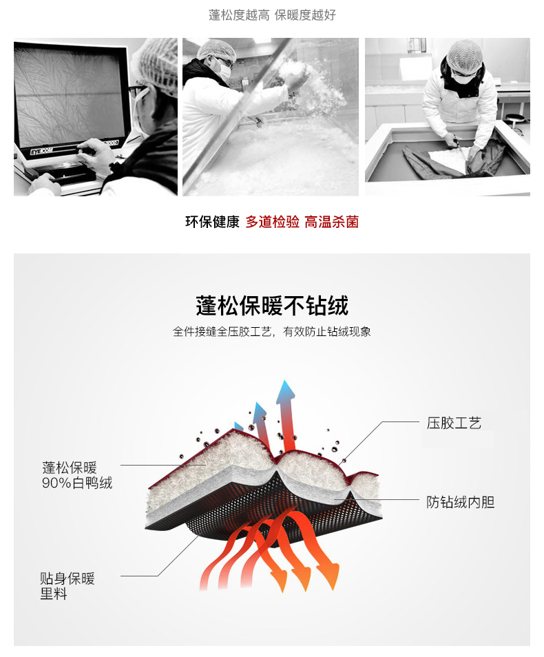 在防钻绒上,先车出羽绒隔舱后充绒的方式,避免羽绒移位,影响保暖效果,接缝处用压胶封死,防止绒毛钻出。