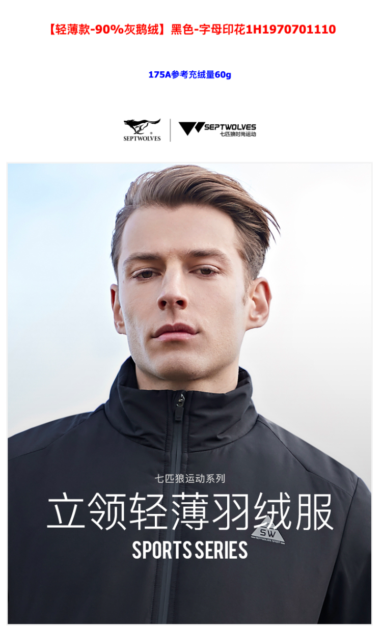 七匹狼的这款男薄款羽绒服,是2018年的冬季专柜款,属是运动系列,采用100%聚酯纤维的防护面料,高密度的外层面料结构,紧实严密,可防止冷风的侵入。还特别添加了防水薄膜和防水压胶加持,可轻度防水,短时防小雨,