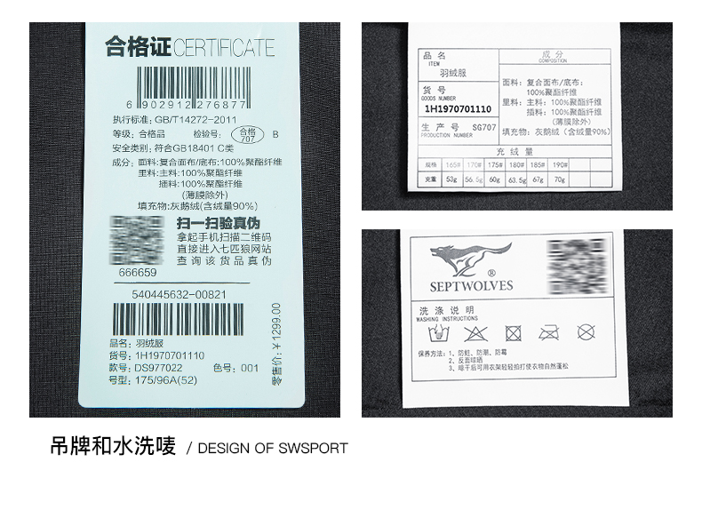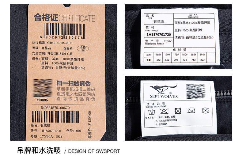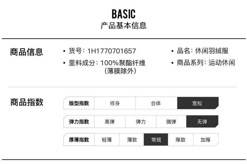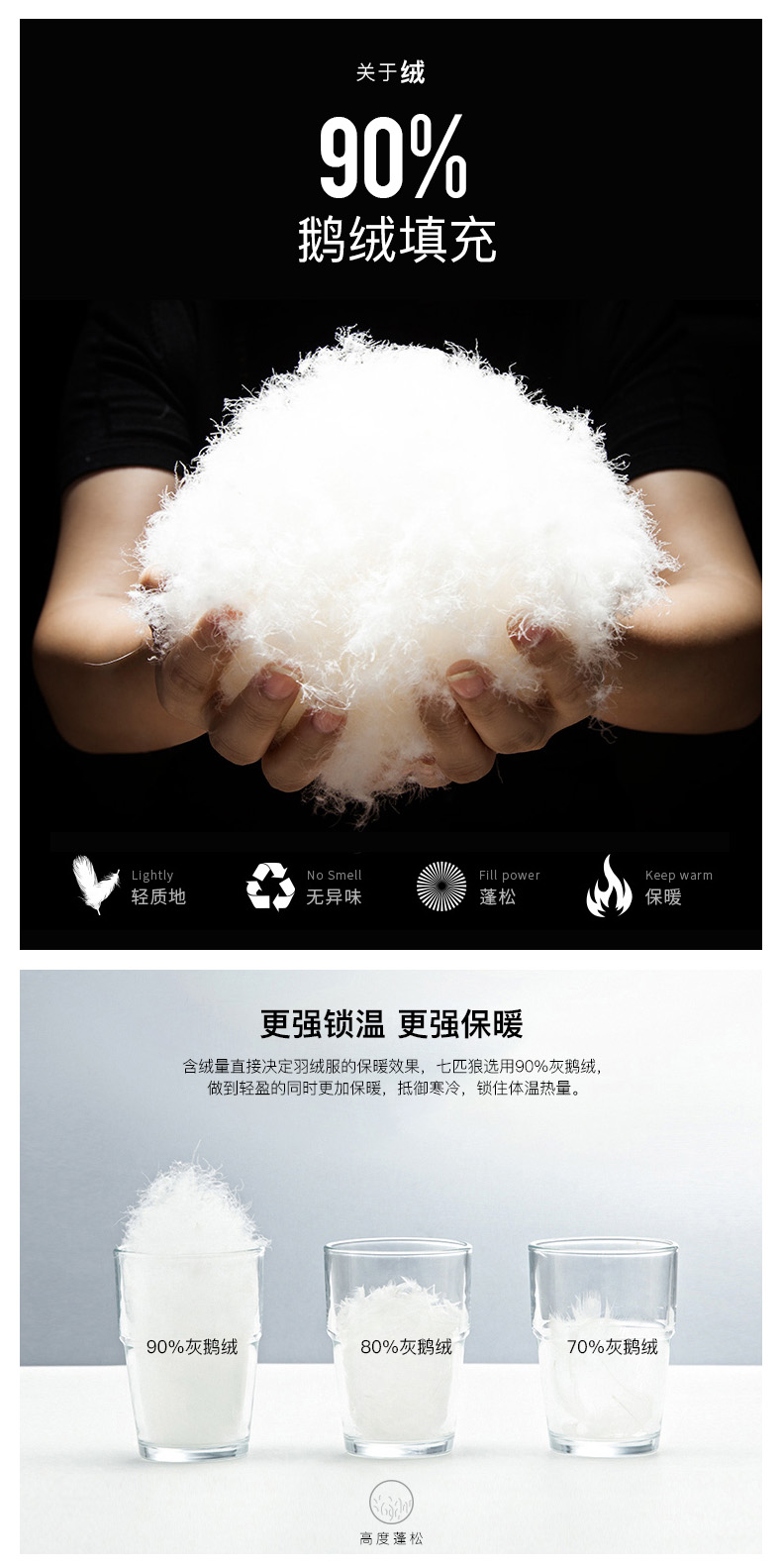 具体充绒量:165码 61g、170码 65g、175码 70g、180码 73g、185码 76g、190码 80g