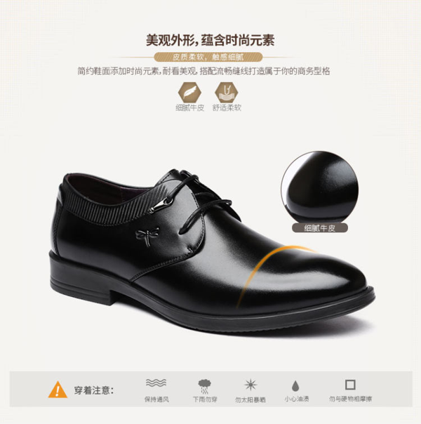 鞋面采用头层牛皮制作,纹理细腻,柔润有韧性;猪皮内里,脚感舒适,透气吸汗;PU鞋垫,增加舒适度;聚氨酯鞋底,防护耐磨;套脚式设计,穿脱方便。