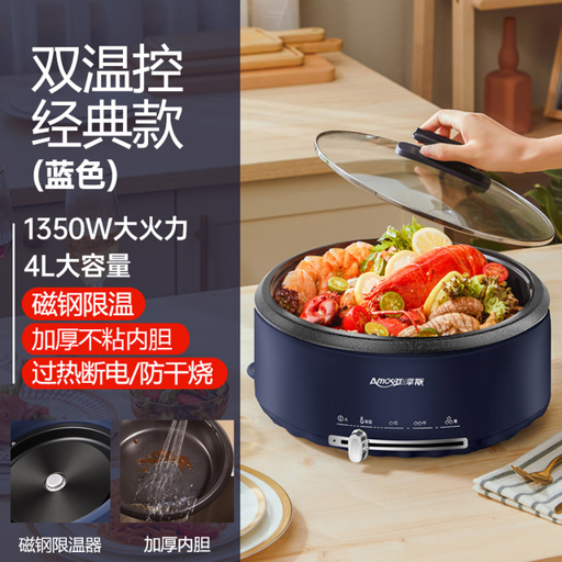 这款亚摩斯 分体式电火锅,也是款多功能一体锅,拥有4L容量,能煎、烤、涮、煮、焖、炖,1350瓦聚能发热盘,双温控断电保护(过热断电+防干烧断电),使用安全放心。