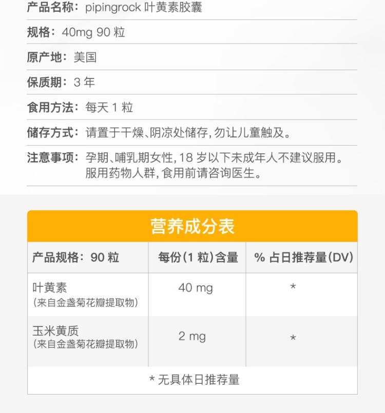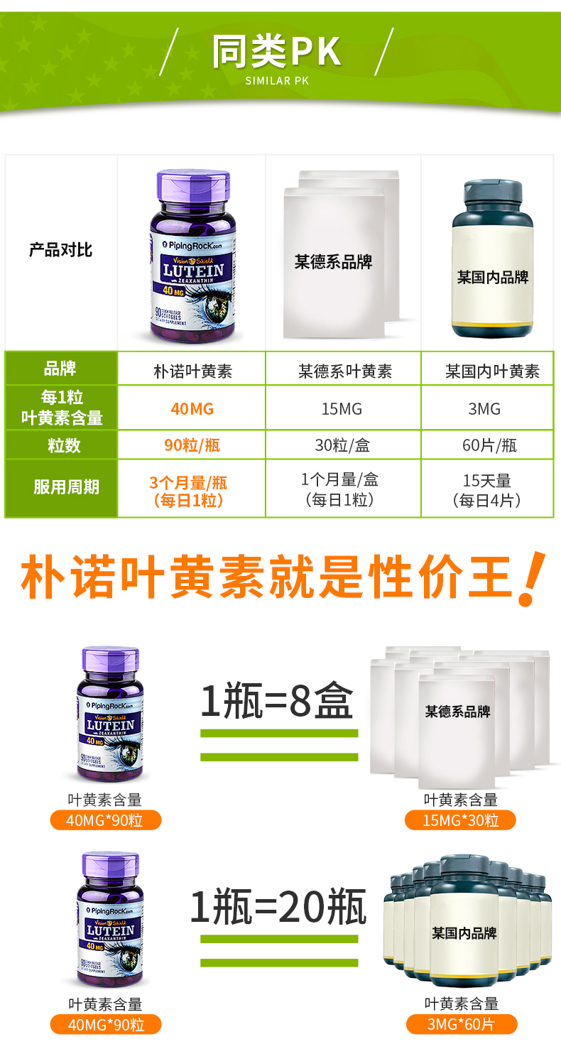 这款PipingRock 叶黄素胶囊,每片含40mg叶黄素,相当于24斤玉米含量,其活性成分玉米黄素高达1600mcg,远远高于市场同类品牌,吸收利用双效倍增,能有效缓解视疲劳症状(如视物模糊、眼干涩、眼胀、眼痛、畏光等,经常食用叶黄素者可预防重度近视及视网膜剥离,并有利于提高视力,还能大大降低冠心病及中风的发病率。