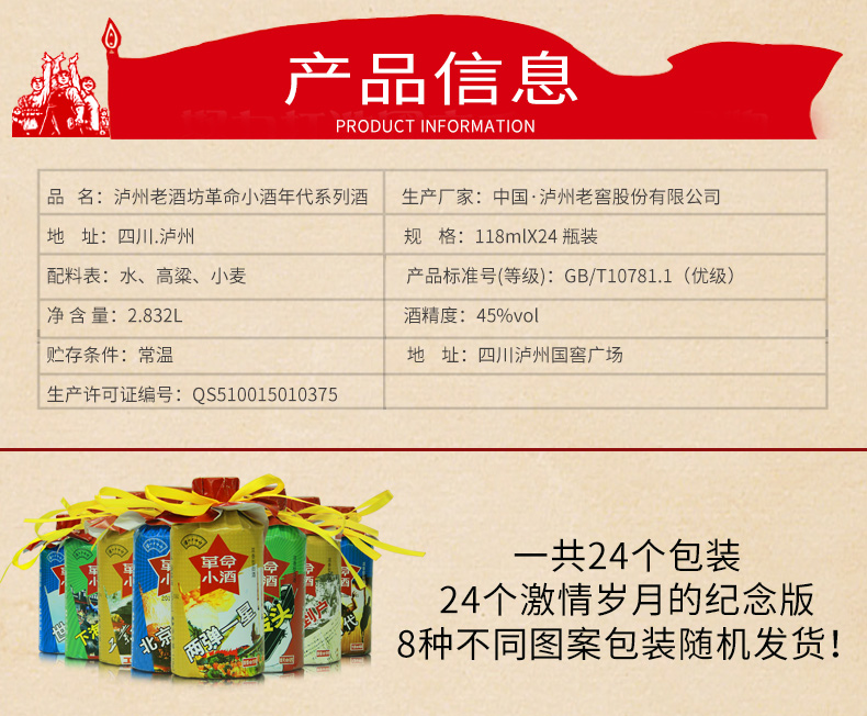 天猫泸州老酒坊旗舰店368元,可领200元优惠券,实付168元到手;泸州老酒坊旗舰店出售,品质有保证,革命版系列,岁月新版,取材自泸州老窖基地的红糯高粱,继承了泸州老窖白酒精髓,经老窖窖池采古今结合之酿造工艺酿造而成,酒色清亮透明、酒质醇香绵甜、酒香浓香馥郁。规格:118ml*24瓶,45度浓香型,适合聚会时饮用,增添氛围,一餐一瓶刚刚好。