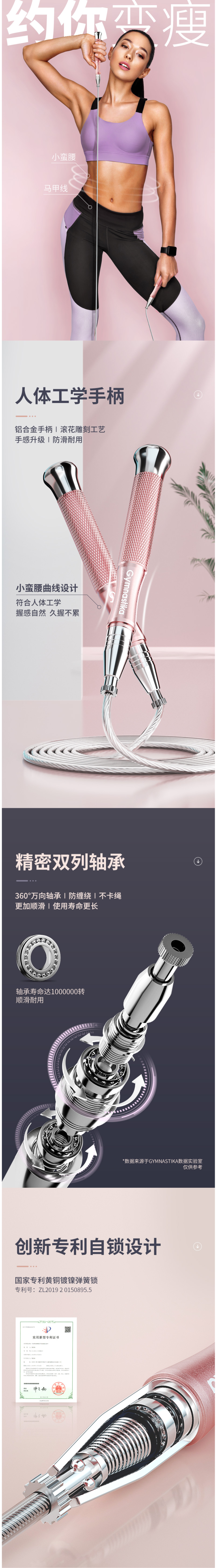 手柄里还内置精密双轴承,高强度运转持续顺滑,不会有卡绳的情况发生,耐磨损使用寿命也更长。4mm加粗钢丝跳绳,内里是49芯记忆回弹钢丝,记忆回弹PVC材质包裹,柔软坚韧耐磨不打结。