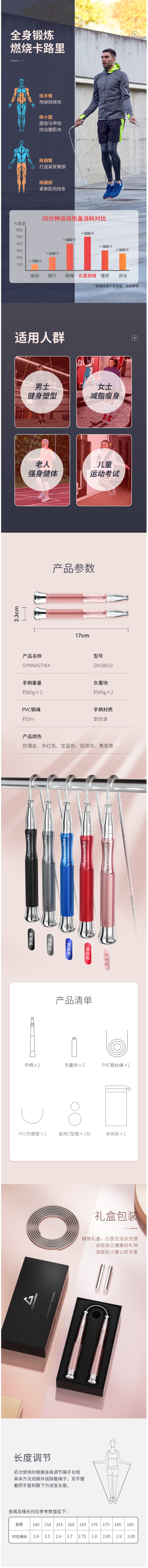 这款戈那斯Gymnas 自锁轴承钢丝跳绳,属于竞速自锁跳绳,手柄上可负载90g的负重块,提高运动效果。一体成型铝合金手柄,结实耐用,外层滚花雕刻工艺,握感舒适防滑。