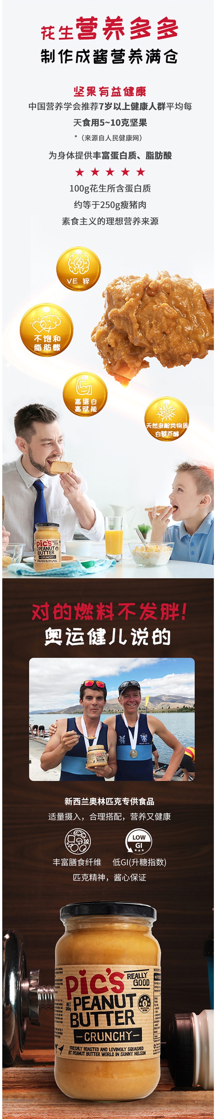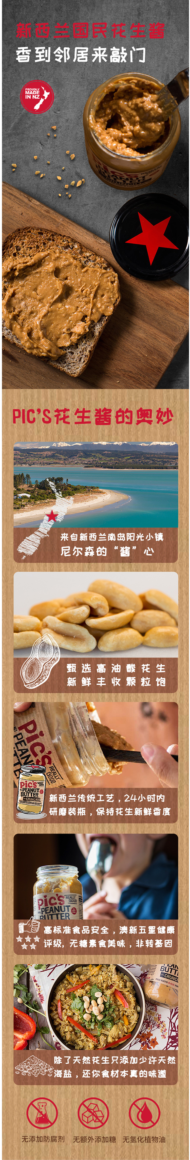 Pics的花生酱是新西兰国宝级的花生酱,也是全球最畅销的花生酱,在2014年新西兰最佳儿童食品提名奖1、2016年获得了世界星级美食大赛GREAT TASTE大奖,这个奖项堪称食品界的“奥斯卡”,含金量无可争议。
