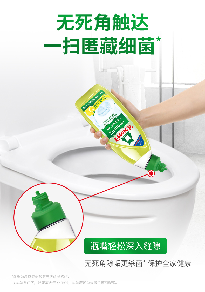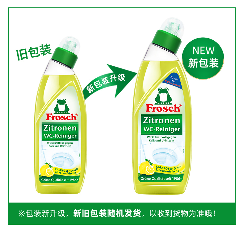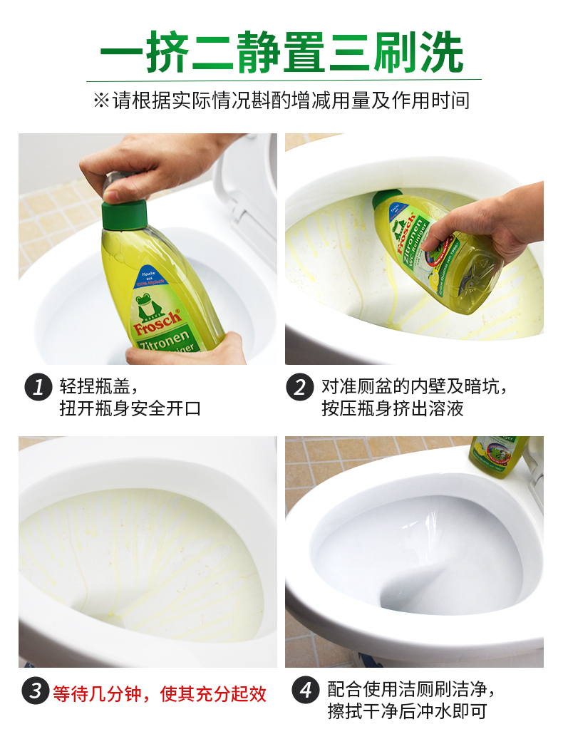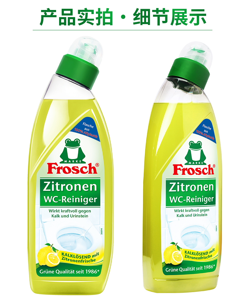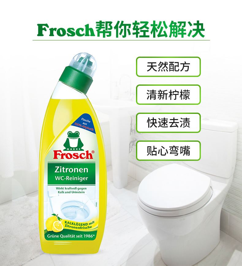 这款Frosch 柠檬马桶清洁剂,德国进口,萃取柠檬酸和表面活性剂,能迅速瓦解污渍,增稠配方能持久挂壁溶解污渍,瓶口是歪嘴设计,能深入缝隙暗沟,轻松去污不留死角。