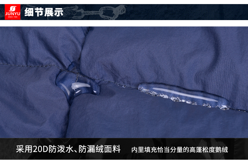 「防钻绒处理」面料与填充的羽绒,使用先车出羽绒隔舱,后充绒的方法,在制作外层面料过程中,羽绒隔舱就预先织出来,后填充羽绒,这样可有效避免羽绒从针眼钻绒。