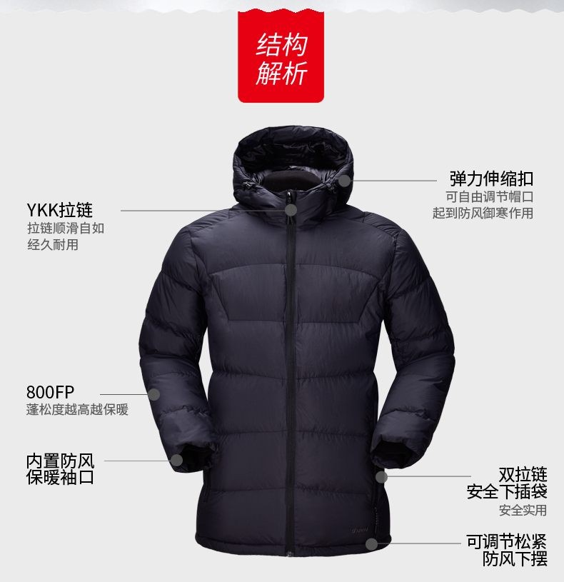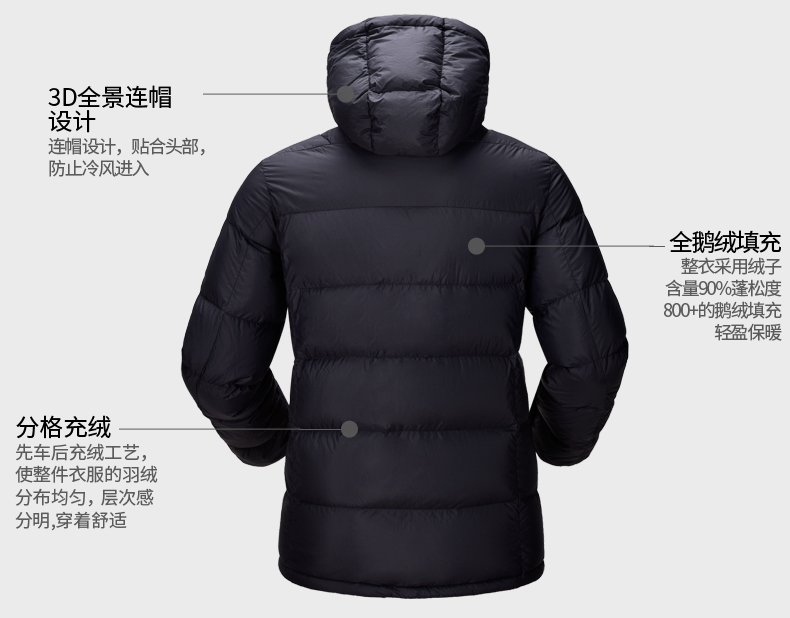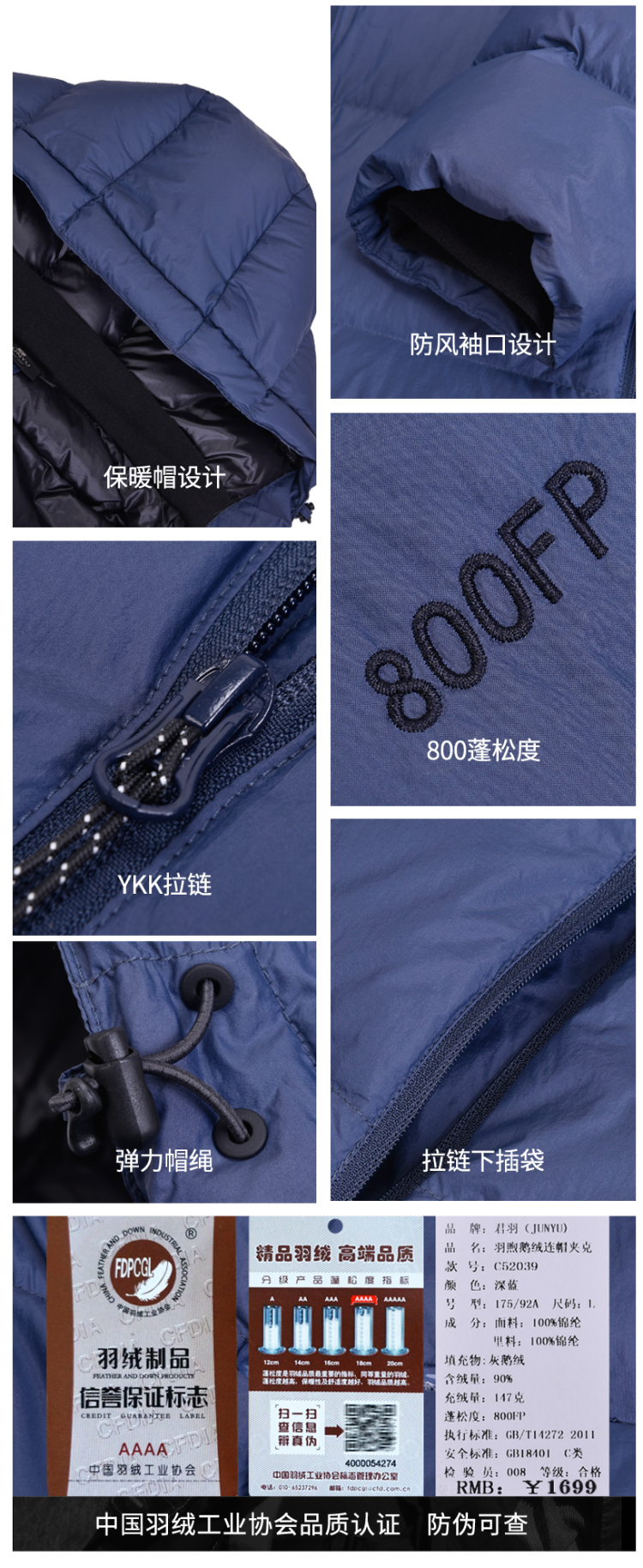 「鹅绒」800蓬鹅绒成本约是普通鸭绒的10倍,没有鸭毛的腥味,保暖效果更好:「147克 800蓬鹅绒」≈「190克 700蓬普通鹅绒」≈「272克普通鸭绒」,可以穿的又轻又暖。