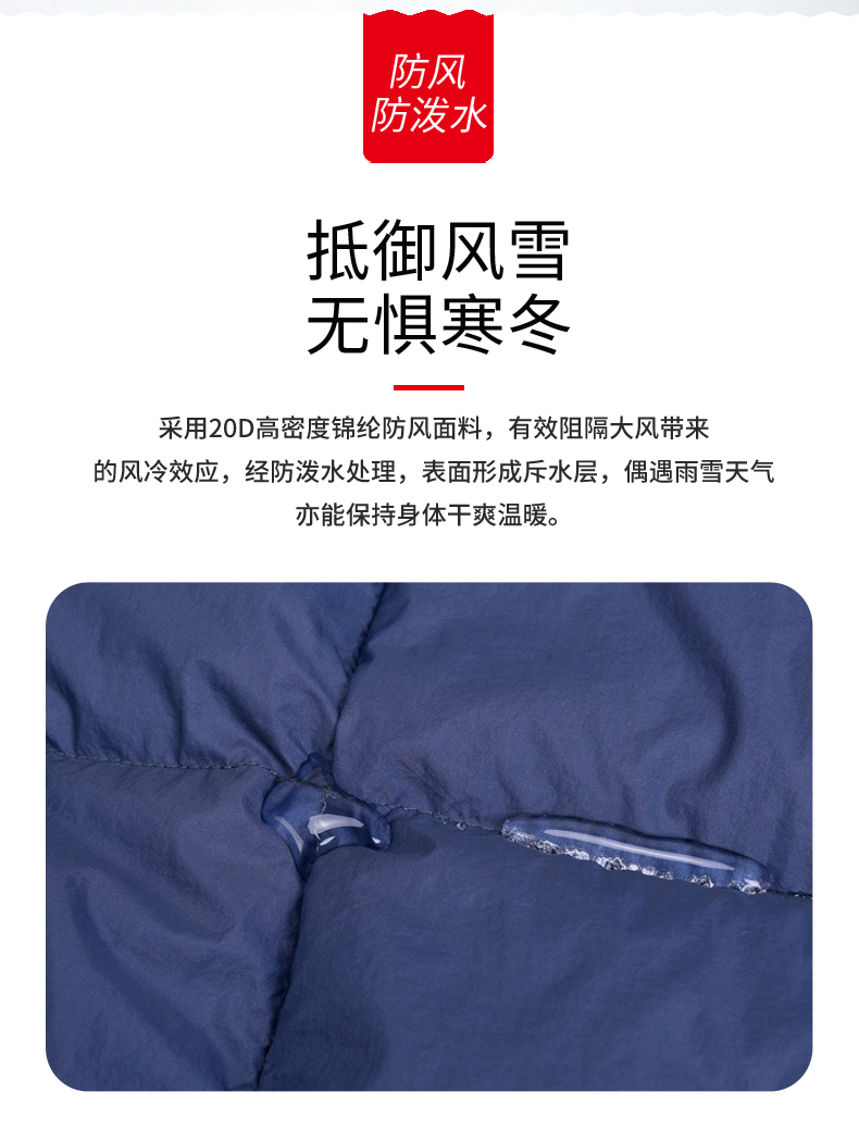 外层面料上,使用日本东丽的20D尼龙面料,防风防泼水。保持面料长期干爽、洁净。羽绒采用先车出羽绒隔舱后充绒的方式,缩绒针细针眼搭配粗线的防钻绒工艺。