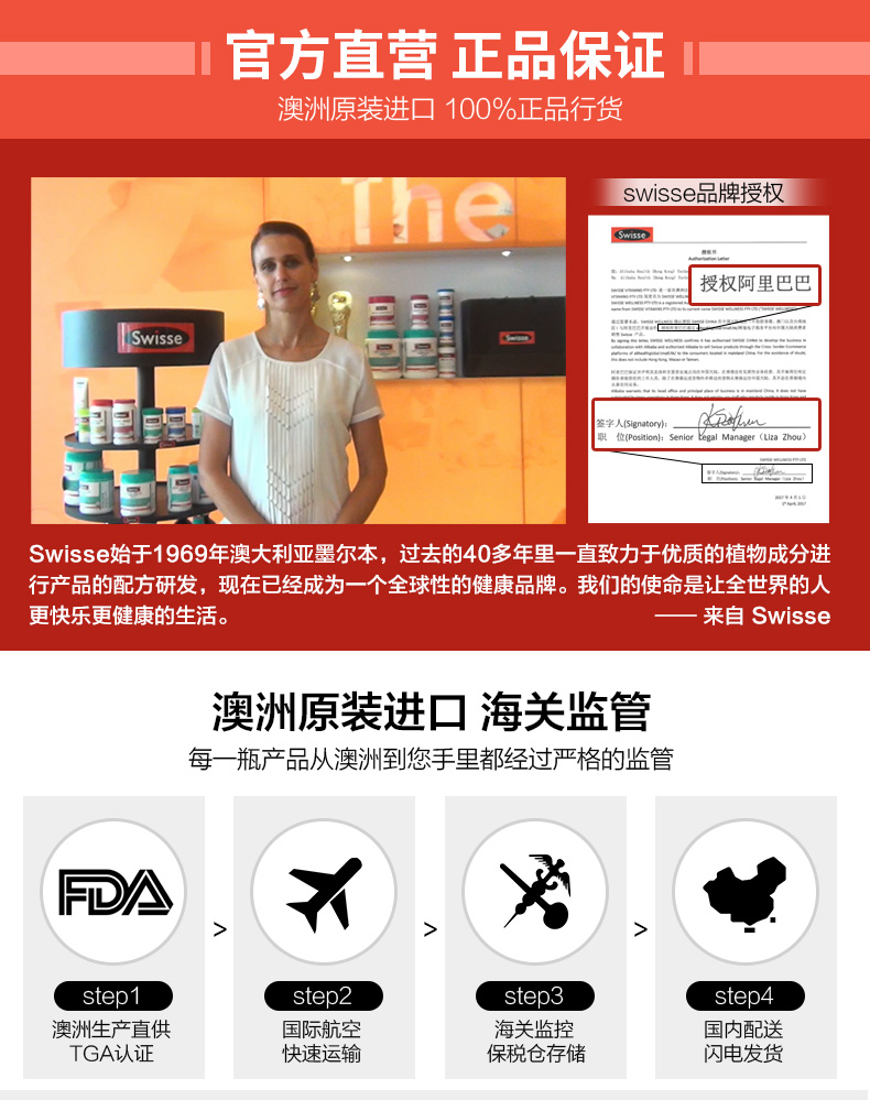 Swisse公司始创于本世纪50年代末成立于澳大利亚墨尔本,澳洲自然医学疗法的先驱之一。超过25年的科学研究和临床试验的基础,澳洲最知名的保健品牌,其原料采购和生产工艺均通过全球最高处方药的生产标准TGA。这个牌子的保健品在澳洲还是比较出名的,之前几年没有天猫国际的时候,很多朋友都是代购这个牌子的保健品。