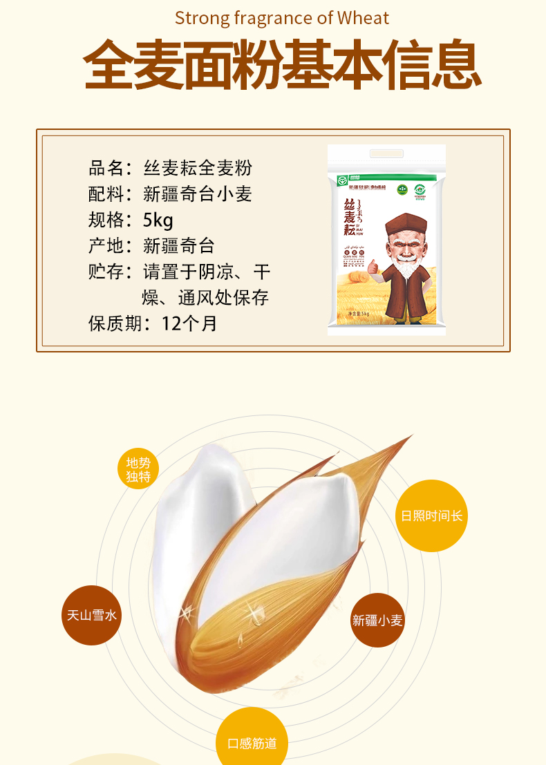 奇台地区的气候属于典型的内陆型气候,夏季干旱炎热,昼夜温差大,6月份降水稀少,有利于小麦生长灌浆。由于得天独厚的水土光热资源,生产的小麦面筋含量和蛋白质含量都很高,奇台县境内及周边近百公里内没有重工业,土地没有受到污染,空气清新,水源洁净。农民用来给小麦施肥,化肥和农药用量赿来趆少,生产的小麦都是无公害食品。因此被国家农业部命名为“全国优质小麦之乡”,加工的面粉一直畅销全疆内外。
