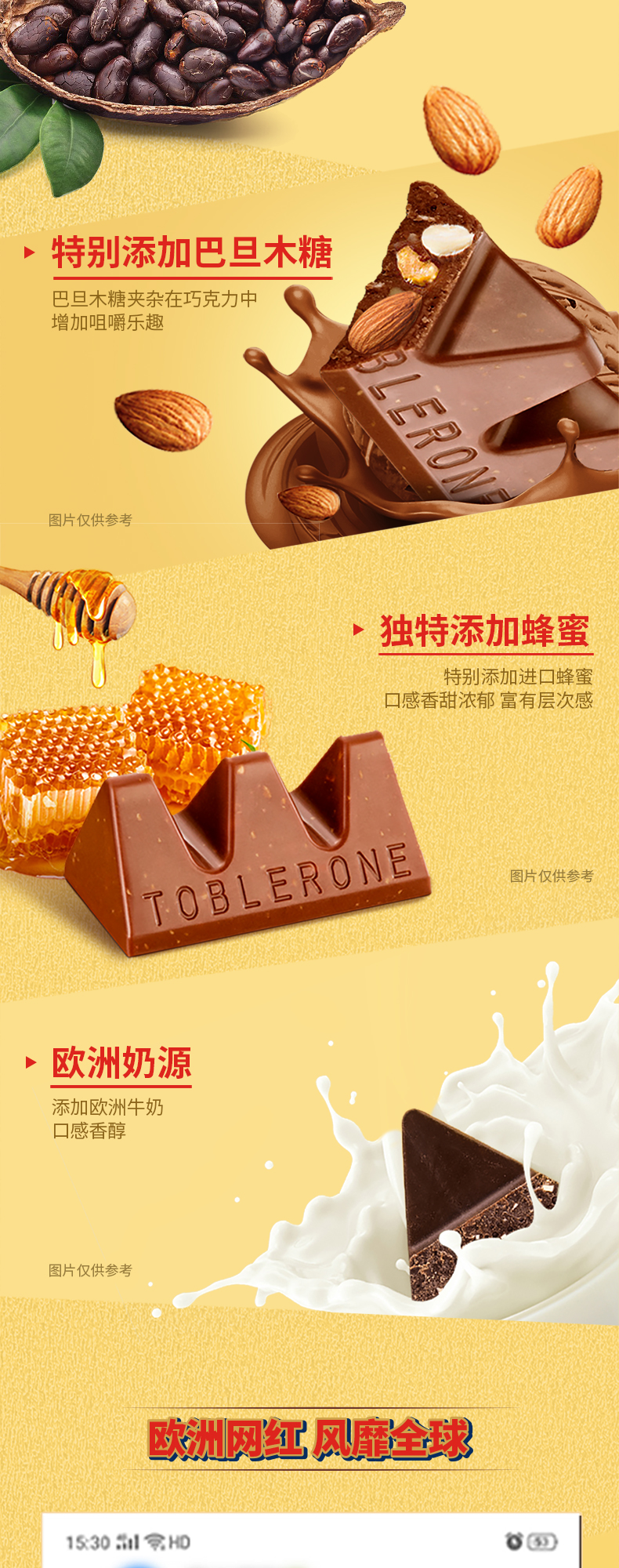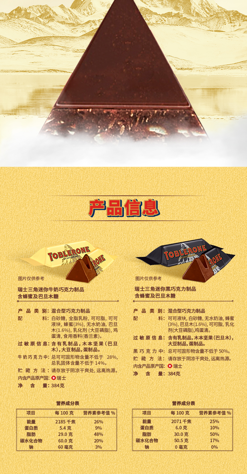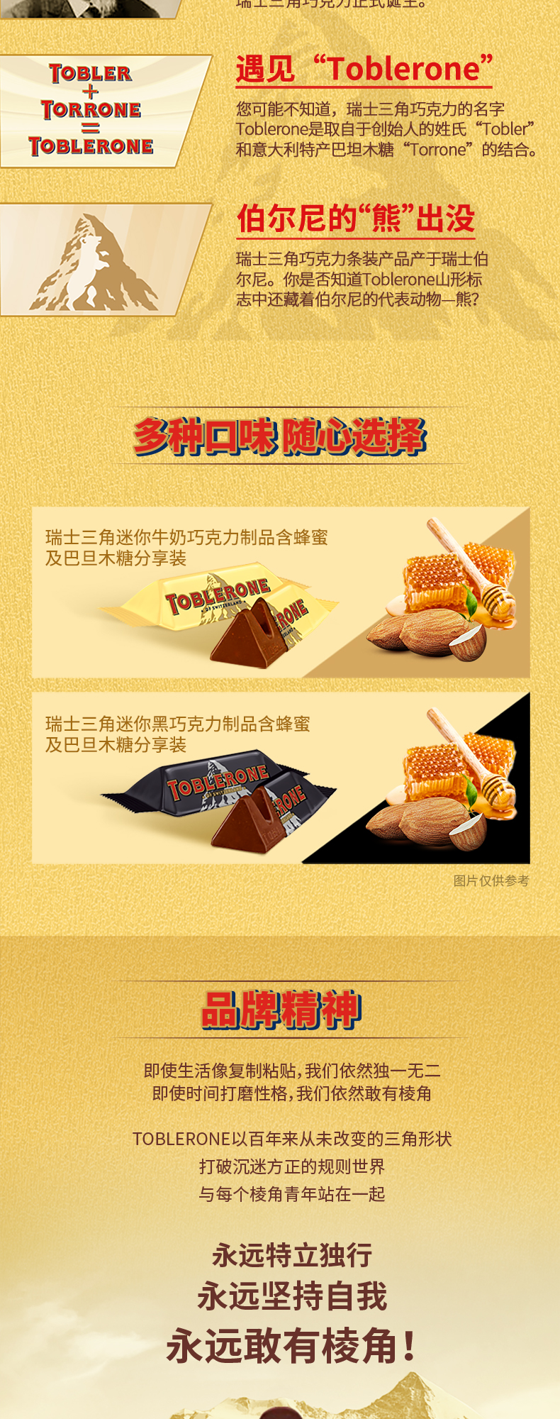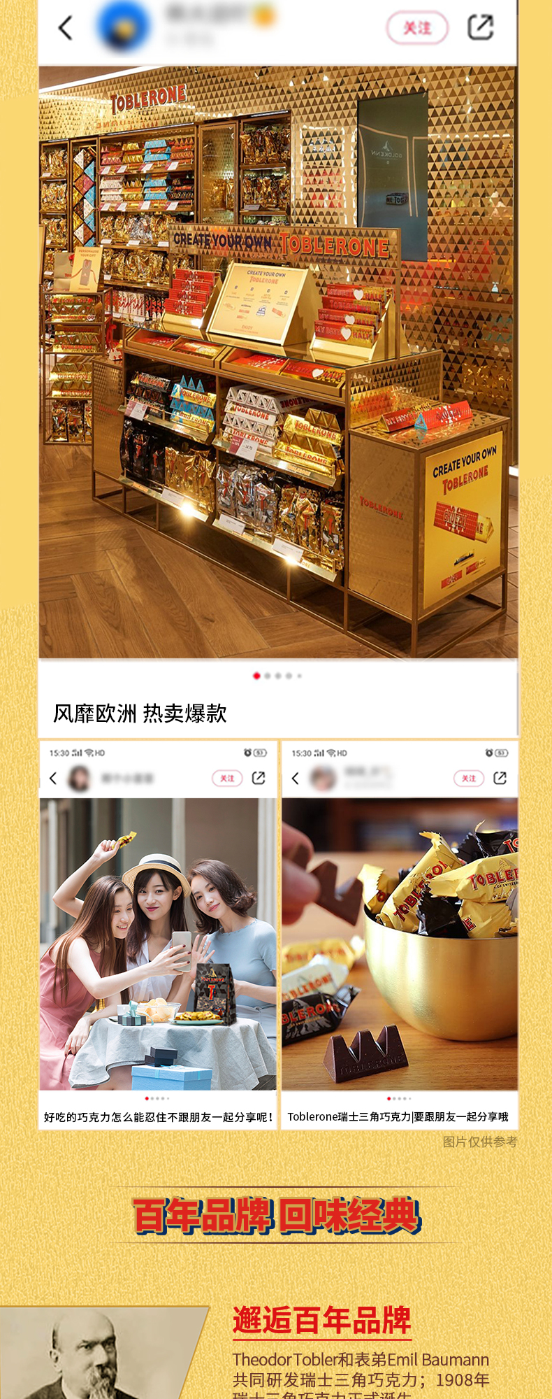瑞士 Toblerone三角巧克力1908年诞生,以瑞士牛奶巧克力配以蜂蜜和杏仁造就了其独特口味。按照阿尔卑斯山的样子,将三角形作商标的瑞士三角巧克力,以其新颖的造型,深受众人喜爱。