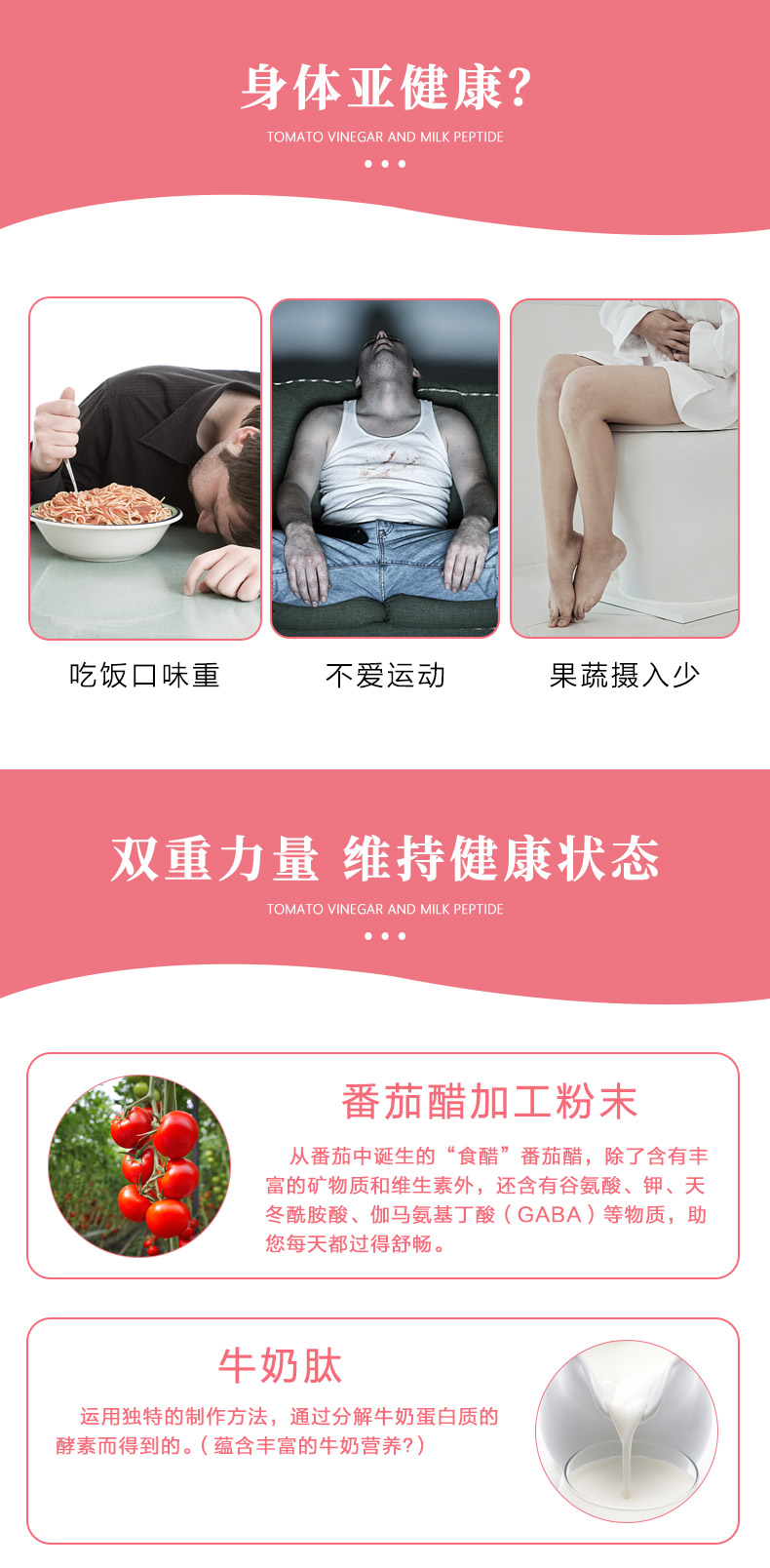 番茄醋是从番茄中诞生的食醋,含有丰富的维生素和矿物质,还能润滑肠道,改善便与排毒,将体内多余的水分与废物排出体外,消除水肿,改善易胖体质。牛奶肽则是通过分解牛奶蛋白质的酵素得到,能提高身体质量,元气满满。