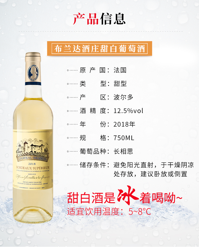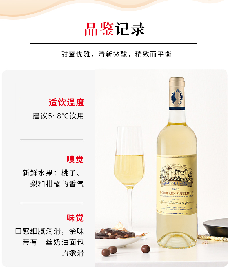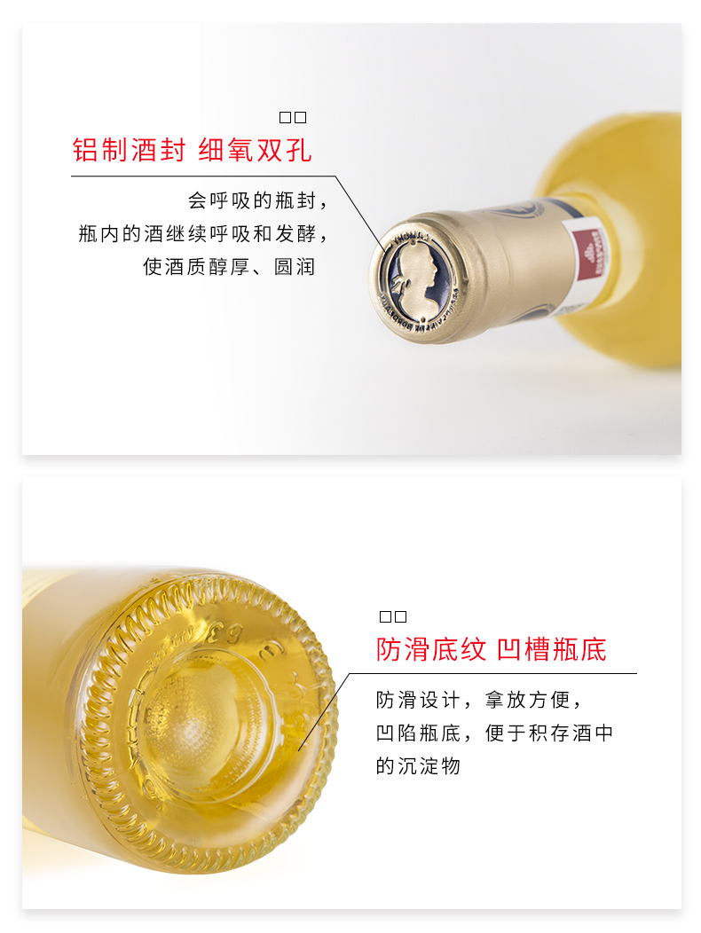 铝制酒封细氧双孔,便于瓶内的酒继续呼吸和发酵,使酒质醇厚、圆润。适饮温度5-8℃,可与蛋糕海鲜类搭配。