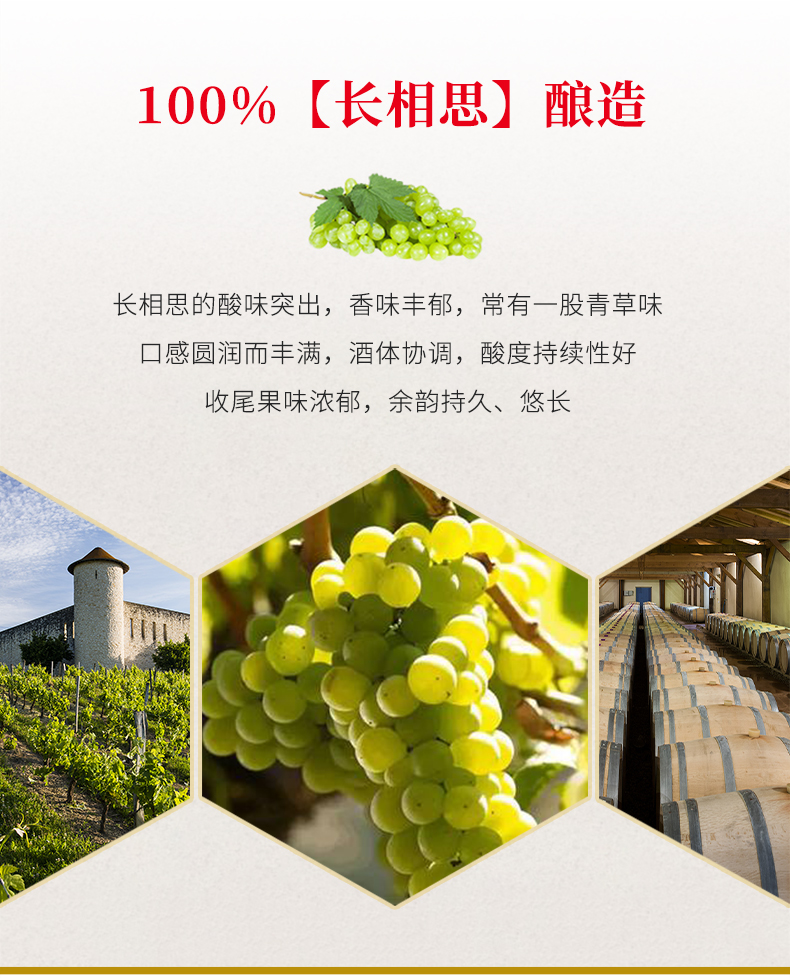 采用40年老藤“长相思”白葡萄为酿造,0糖添加,酸味突出,香味丰郁,收尾果味浓郁,余韵持、悠长。在经过6个月橡木桶陈酿,香味更协调,有蜜桃、柑橘、梨的花果香气,口感更为细腻润滑,余味带有一丝奶油面包的嫩滑。