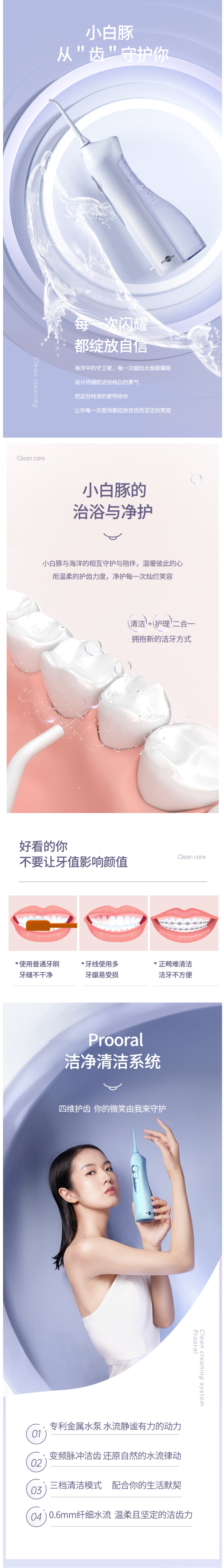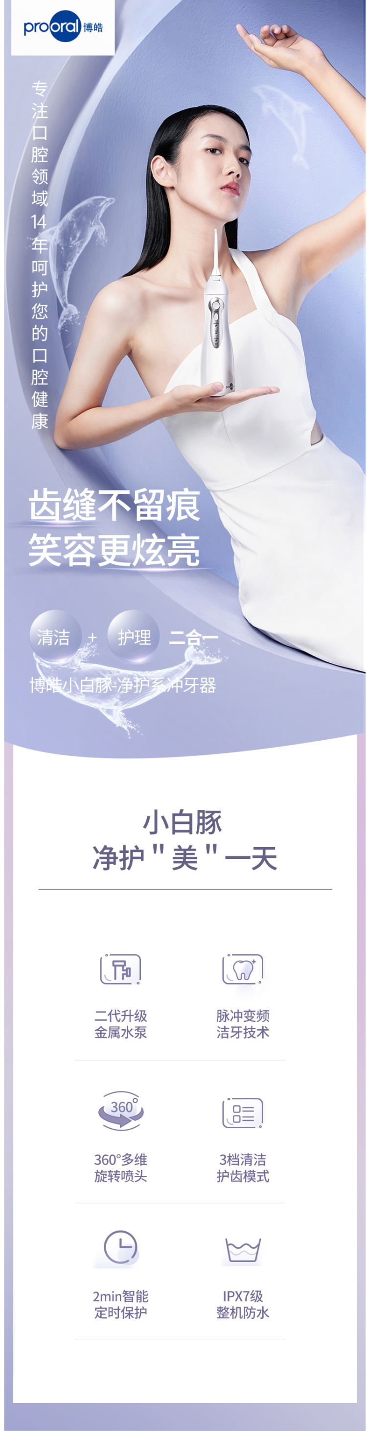 0.6mm的纤细水流,将水流温柔包裹齿间,全方位清洁护齿不伤牙龈。360°多维旋转喷头,多维度清洁牙缝。IPX7级整机防水,连续4小时可满电。