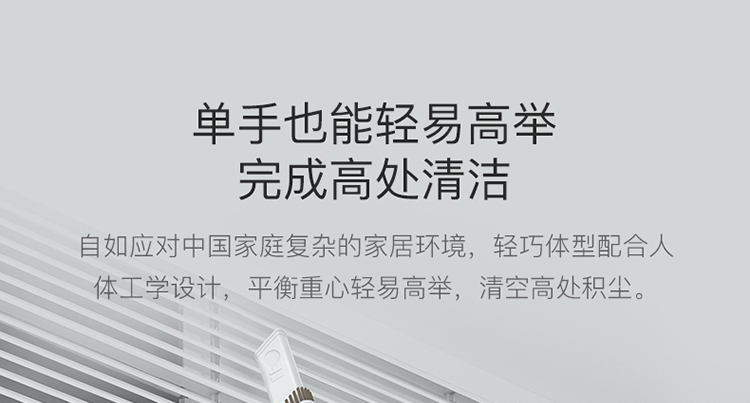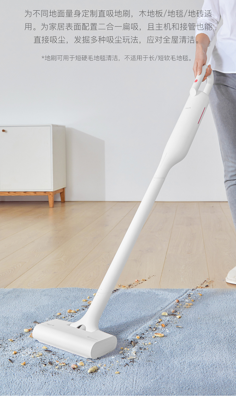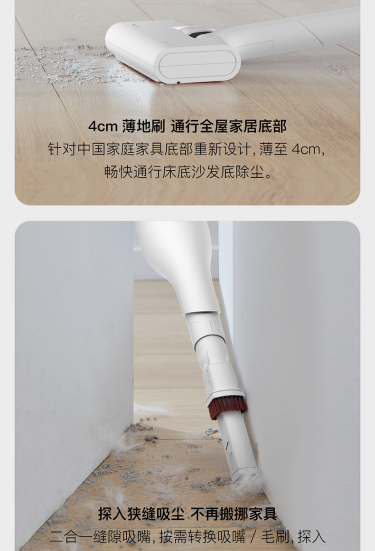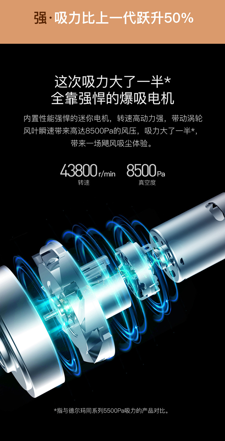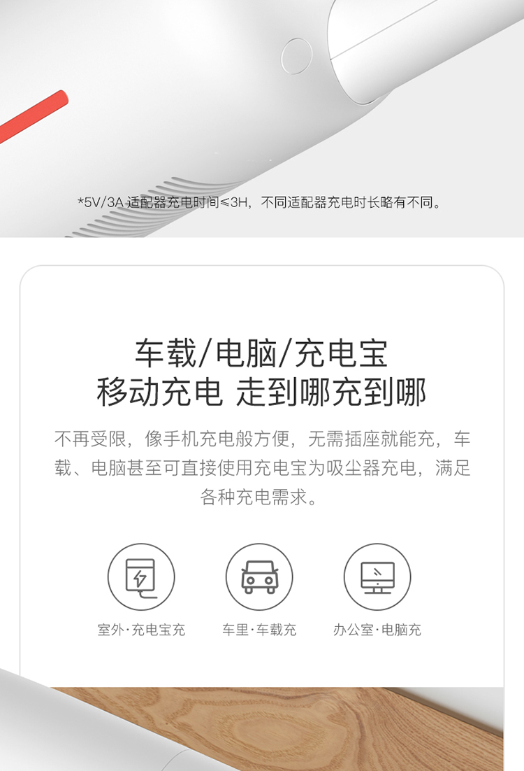 内置性能强悍的迷你电机,带动涡轮风叶瞬速带来高达8500Pa的风压,真空度可达8500Pa,相比上一代吸力提升约50%;实验搭配吸盘测试可轻松提起50斤箱子,配有二合一扁吸头、地刷、内置2200mAh锂电池,满电后能提供30分钟续航,无线使用更灵动,车载、电脑、充电宝可直接为其充电,非常方便。